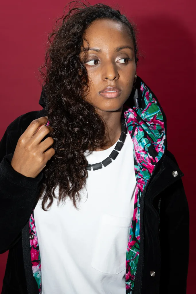 アフリカンプリントが大胆にあしらわれたパーカーと、着物の美学とアフリカの色彩が融合したギモノコートは、「私らしさ」を纏う大人の遊び心。これ一枚で主役級のスタイルに。ギモノコート:44,000円 / パーカー:14,300円
