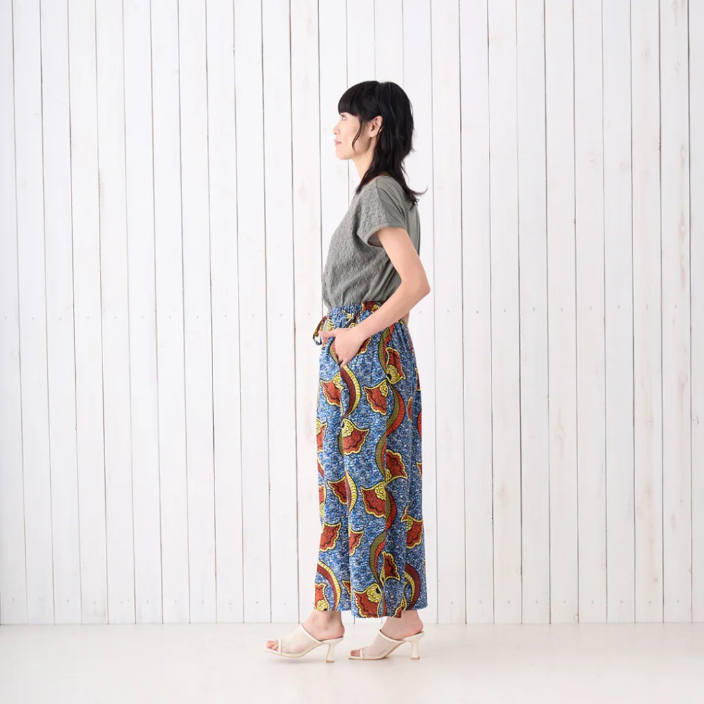 ケニアやナイジェリアのアフリカ布を用いて日本国内で縫製したスカートやパンツなどのアパレルアイテム。(5,500円〜)